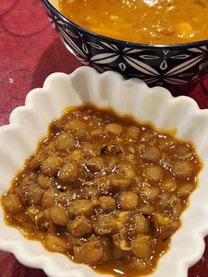 細かいヌードルと豆にスパイスやハーブが効いていて食欲を刺激するよう。